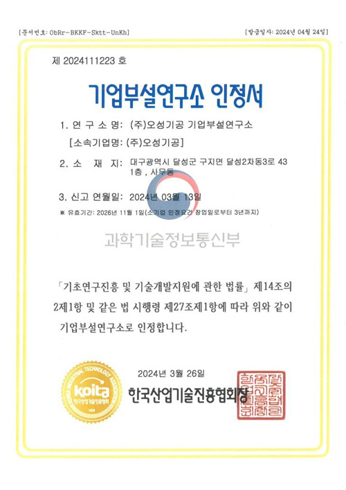 기술부설연구소 인정서